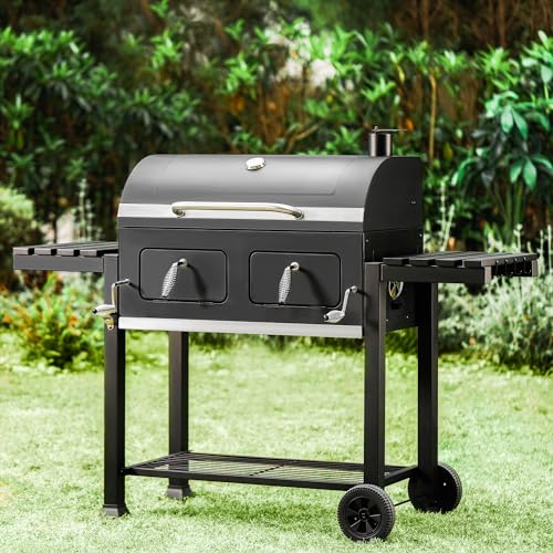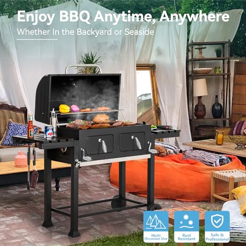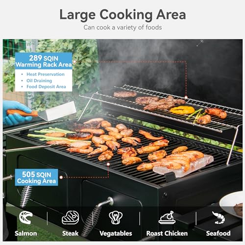 Specification: GREEN PARTY Barrel Charcoal Grill with Side Tables, 794 Square Inches Cooking Space, Large Charcoal BBQ Grill with 2 Height-Adjustable Charcoal Pans for Outdoor Backyard Patio Picnic Parties Camping