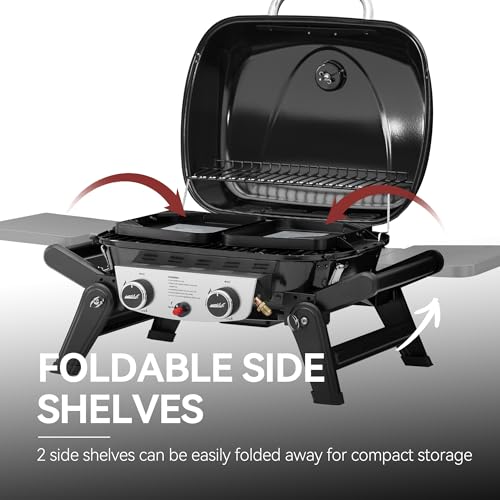 Specification: Royal Gourmet GT2005 2-Burner Portable Propane Gas Grill with Foldable Side Tables & Foldable Support Legs, Tabletop Gas Grill with Warming Rack for for Outdoor Cooking & Grilling, Black