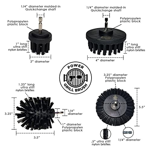 COMPLETE SET OF ROUND GRILL BRUSHES – This wireless drill brush set contains 5 accessories; 4 brushes and a drill bit extender. Two of the brushes are 2 inches in diameter, one with small bristles and one with relatively longer. There is one 5 inches and a 4 inches flat brush to clean that covers larger surface areas. All commercial grade ultra stiff nylon safe grill brushes. Bushes are ment to be used on a cool, cold grill and griddle. Power Grill Brush are very durable brush/scraper set. Power Grill Brushes will not damage your grill like metal scraper will. Rescue your cleaning routine with our complete brush set, and rescue even the toughest messes. Heavy Duty brush set ever.
