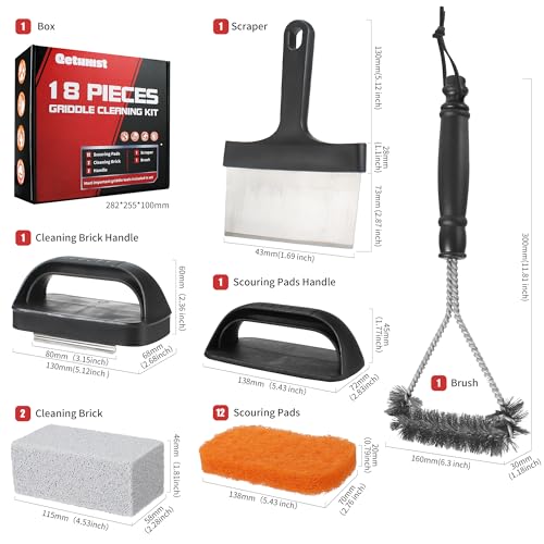Specification: Griddle Cleaning Kit for Blackstone, 18 Pieces Flat Top Grill Cleaning Kit with Durable Griddle Scraper, Grill Brush, Grill Stone and Scouring Pads, Griddle Accessories Set for Easy Grill Restoration