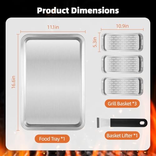 【Generous Size & Practical Design】- The bbq prep tray measures 16 x 11 x 1.75 inches and fits all three baskets simultaneously, offering ample space for large meals. This bbq pans for grilling set is your go-to solution for effortless grilling and serving.