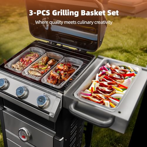 Grill Basket Set, 3-Piece Stainless Steel Grill Topper Pans for Outdoor Grill with BBQ Prep Tray, Grilling Baskets Barbecue Accessories for Vegetables, Fish, Meat, and Seafood