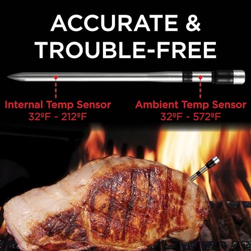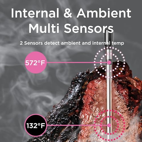 Ambient & Internal Sensors | The wireless temperature probe features dual sensors to monitor both internal meat temperature (up to 212°F) and ambient temperature (up to 572°F) with ±1.8°F accuracy. Ensure precise control for your grill or oven.