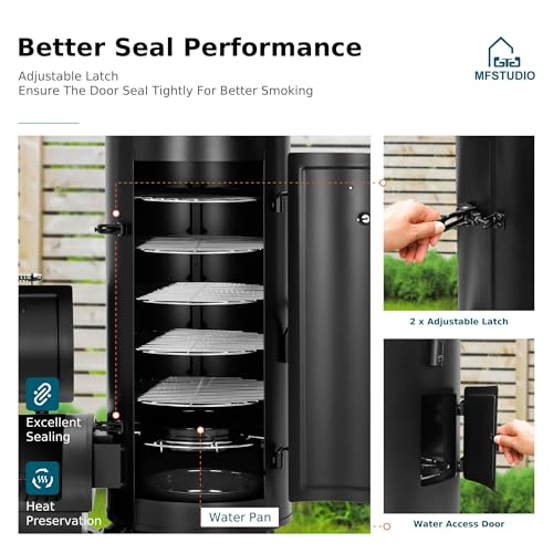 Better Seal Performance-Economical and Delicious:Built with heavy duty steel providing stability and consistent heat retention, enhancing the smoking process. Adjustable latches ensure that the smoker door stays tightly closed during the cooking process, minimizing heat and smoke loss and resulting in more efficient and effective smoking