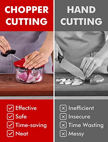Efficient Manual Food Chopper: Equipped with Japanese 420 stainless steel blade, our pull string chopper is ultra sharp for chopping veggie up. This pull chopper changes the chopping way, pulling string one time equals at least knife cuting twenty times and scraper included, rotating with the blade helps food can be chopped again evenly. Only a few pulls make it all done. Saving lots of time
