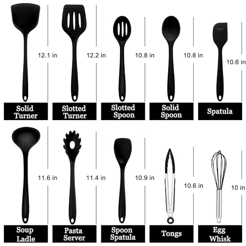 Specification: E-far 10 Pieces Silicone Cooking Utensils Set, Heat Resistant Kitchen Utensil Set for Nonstick Cookware, Kitchen Cooking Tools with Spatula, Spoon, Slotted Turner, Non-Toxic & Dishwasher Safe (Black)
