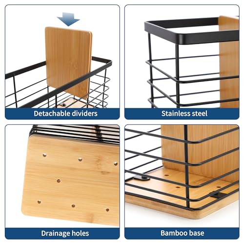 【Effortless Accessibility】 Embrace the ease of organization with our wide-mouthed metal wire construction and robust bamboo base. The 3 detachable central dividers provide adaptability, effortlessly accommodating various utensil sizes and guaranteeing convenient access whenever needed
