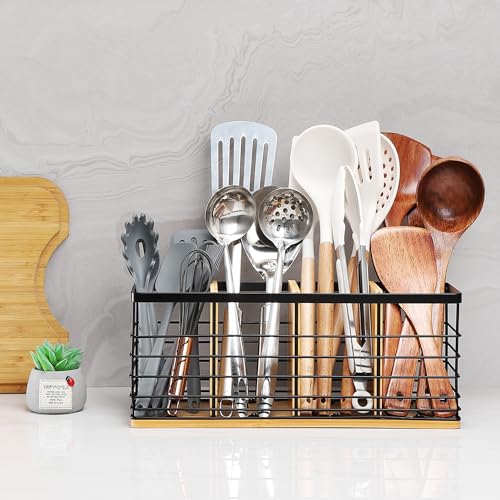 【Timeless Durability】 Elevate your kitchen ambiance with our sleek matte black utensil holder, meticulously crafted from stainless steel wire and accentuated by a rustic bamboo base. Its enduring design resists rust, ensuring a lasting allure that seamlessly integrates into any kitchen motif, from modern to rustic