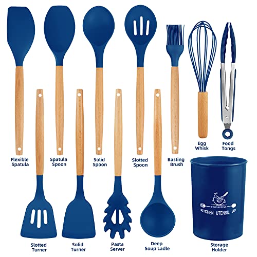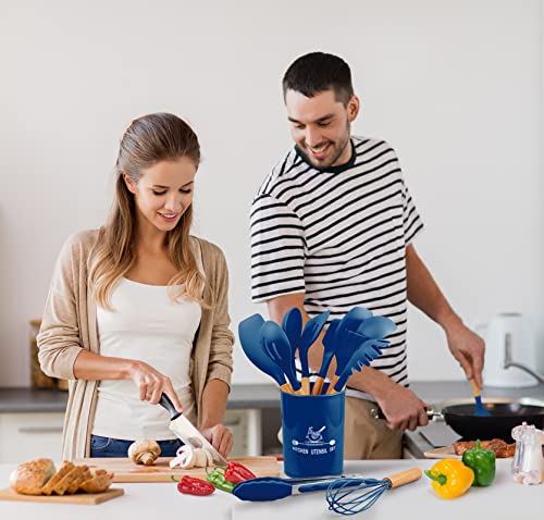 Specification: Silicone Cooking Utensils, 12 Pcs Kitchen Utensil Set 446°F Heat Resistant,Turner Tongs Spatula Spoon Brush Whisk with Wooden Handles, Blue Kitchen Gadgets Tools Set for Nonstick Cookware (BPA Free)