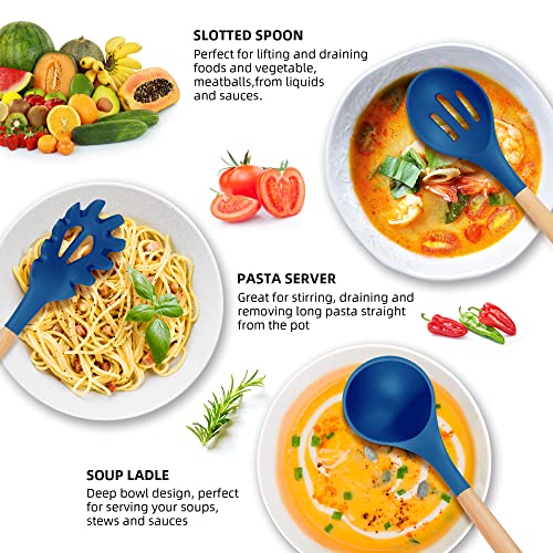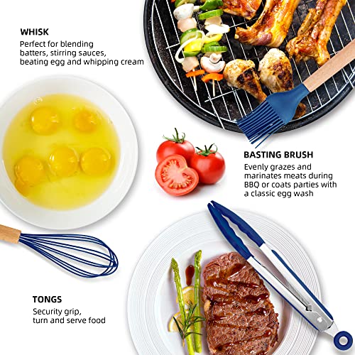 Silicone Cooking Utensils, 12 Pcs Kitchen Utensil Set 446°F Heat Resistant,Turner Tongs Spatula Spoon Brush Whisk with Wooden Handles, Blue Kitchen Gadgets Tools Set for Nonstick Cookware (BPA Free)