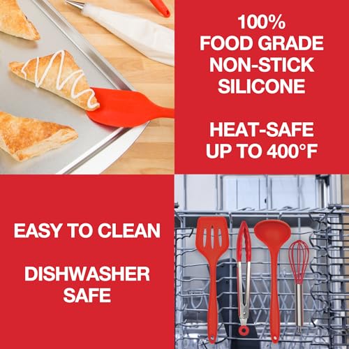 DELUXE KITCHEN UTENSILS: Good Cooking 10 piece set made from 100% food grade silicone, including Spatula, Spoon, Slotted Spoon, Tongs, Basting Brush, Ladle, Whisk and more! Great gift for home cooks and bakers alike.