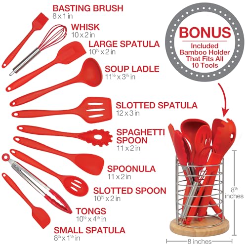 Specification: Silicone Kitchen Cooking Utensils w Bamboo Holder- 10 Pc Gourmet Non-Stick, Heat Resistant, Premium Kitchen Tools Set- Spatula, Spoon, Slotted Spoon, Tongs, Basting Brush, Whisk, Ladle- Host Gift