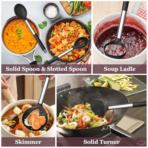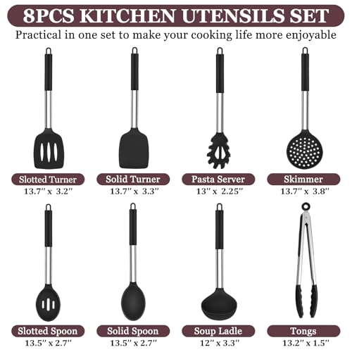 TeamFar Kitchen Utensils Set of 8, Silicone Utensils Kitchen Tools Set with Stainless Steel Handle, for Frying Serving Flipping Draining, Non-toxic & Heatproof, Nonstick & Dishwasher Safe – Black