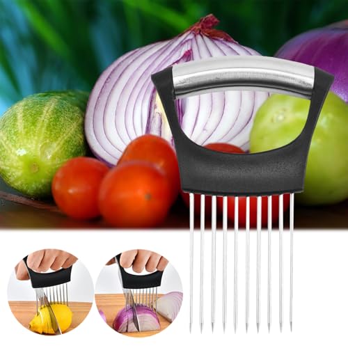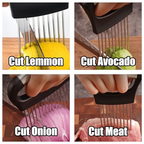Onion Holder for Slicing, 2024 Upgraded Stainless Steel Lemon Slicer Onion Cutter for Slicing, Vegetable Cutter Kitchen Chopper Slicing Assistant Tool for Potato and Tomato Avocados Eggs Meat (1)