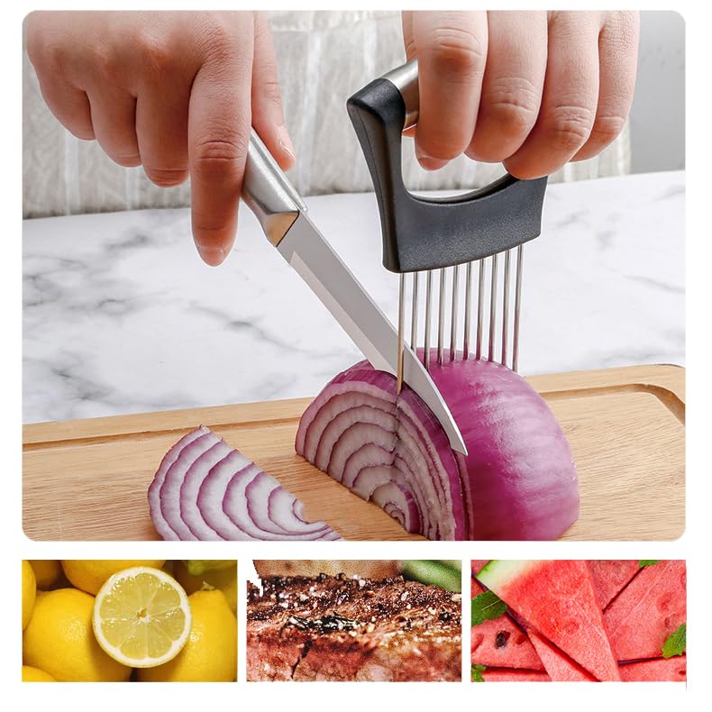 Our Onion Holder Slicer is not limited to onions; it is suitable for various fruits, vegetables, and meats. Its sturdy construction and sharp stainless steel forks make it ideal for a wide range of cutting tasks, ensuring consistent and uniform slices every time.