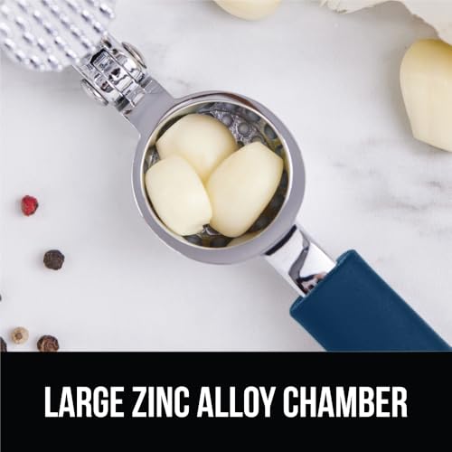 Specification: GORILLA GRIP Garlic Press and Peel Set, Heavy Duty Mincer Tool, Easily Mince and Crush Garlics, Ginger, Nuts, Seeds, Large Ergonomic Handle, Peeler Included for Peeling Cloves, Kitchen Gadgets, Blue