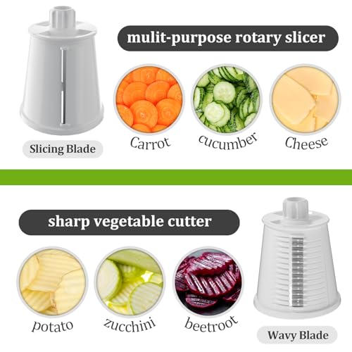 5 Interchangeable Blades: The vegetable grater include shredding blade, coarse grinding blade and fine grinding blade in different diameters are used for shred vegetables or cheese; Slicing blade and wave cutting blade are used for food slicer