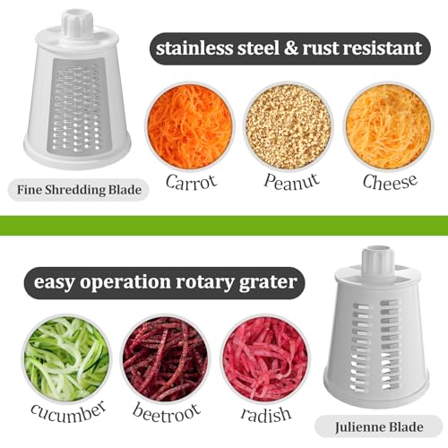 Safe Material: All parts of the rotary cheese grater are made of food grade ABS material; The five blades are made of stainless steel , which is sharp and rust resistant; Keep your ingredients safe and health