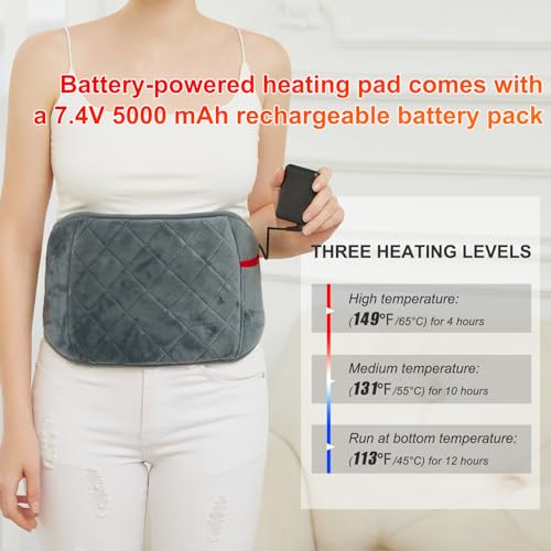 Cordless heating pad with rechargeable battery:The Comfytemp Portable Heating Pad is powered by a 5000mAh battery. It’s no longer tethered to a power cord. Feel free to use it while doing housework, driving, or working on the computer.