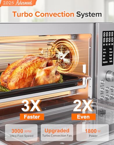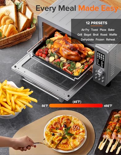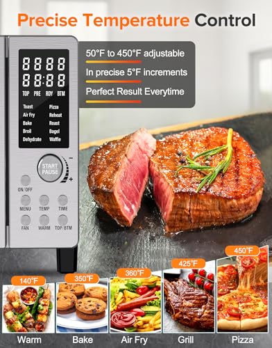 10 PRE-PROGRAMMED PRESETS – This premium 1800-watt toaster oven and air fryer features 10 functions: Air Fry, Grill, Bake, Reheat, Bagel, Pizza, Toast, Broil, Waffle, Dehydrate, Frozen and Keep Warm, all in one powerful appliance.