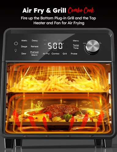 AIR FRYER & GRILL COMBO COOKING: Fire up the bottom plug-in grill and the top heater and fan for combo cooking. You will enjoy 95% less oil for healthier fried foods and savor the authentic char flavor of perfectly grilled meats