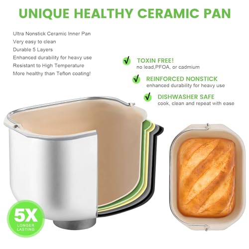 2.2 LB LARGE CAPACITY and FOOD GRADE NON-STICK CERAMIC PAN and 710W COPPER QUIET MOTOR: KEEPEEZ premium ceramic bread pan is BPA-PTFE-Teflon free, effectively locks in the heat, so that the bread evenly charred browning, bread pan can be put into the dishwasher to clean, free your hands, 710W power bread maker by frequency kneading and mixing, the dough is softer and more delicate, easy to make even for novices 2.2LB fresh and tasty large-capacity bread. working less than 35db. The best gift for family.