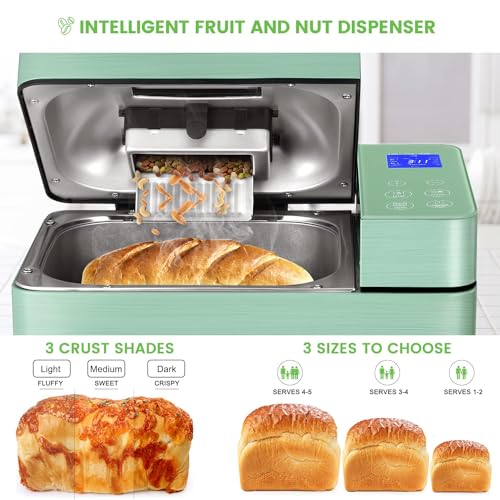 LARGE SMART TOUCH CONTROL PANEL and NUTRITIOUS RECIPES and SLEEK STAINLESS STEEL DESIGN: The gluten-free bread machine is equipped with an intuitive touch panel for more precise and easy menu operation, and the LCD display and viewable window allow you to observe the bread making at any time. Recipes from professional breadmaker make bread more nutritious. The stainless steel bread maker machine is durable, and its sleek green exterior and tempered glass lid add elegance to any kitchen décor.