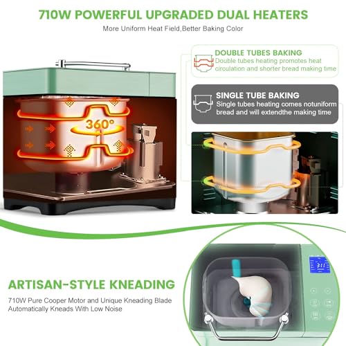 17 NUTRITIONAL CUSTOMIZED MENUS and 360° DUAL HEATING TUBES BAKING: Breadmaker makes basic bread, whole wheat, also can knead, Customized settings for fermentation and baking, and gluten-free settings for making healthy breads. It can also make yogurt, jam, pizza. 360° heating cycle with independent temperature sensing for up to 110% fermentation success rate, Upgraded intelligent inverter technology can adjust baking temperature in real time, even baking color and baking speed increased by 57.6%.