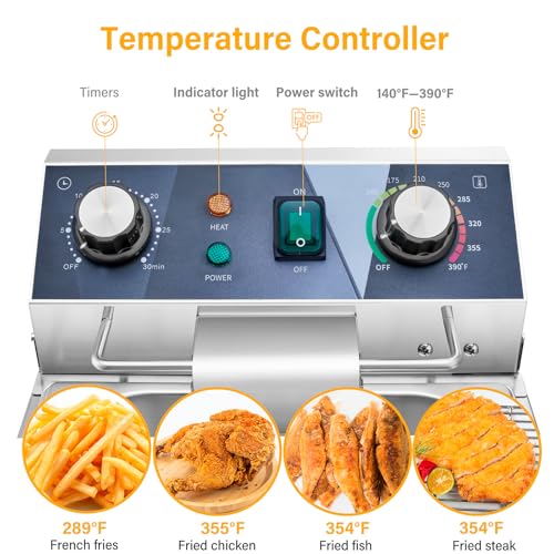 4.Timed Temperature Control: Deep Fryer With Basket Equipped With German EGO Temperature Control And 30minute Timer, The Temperature Can Be Adjusted Between 140F-390F,, Timer Function, Set the Cooking Time You Need, The Fryer Will Be Automatically Reminded To Turn Off (but will not cut off the power