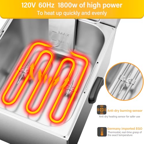 1.Powerful Performance: Electric Deep Fryer Powerful 1800W Power Output And 120V Voltage,to Ensure That The Fryer Quickly And Evenly Heated And Maintain The Oil Temperature, Double Sensitive Probe Can Be More Accurate Temperature Control, 13L Capacity Easy To HandleFried Up Chicken, Fries, Fish, Mozzarella Sticks, Tots,Jalapeno
