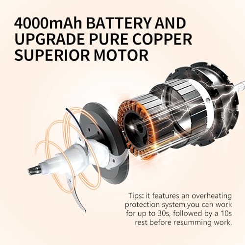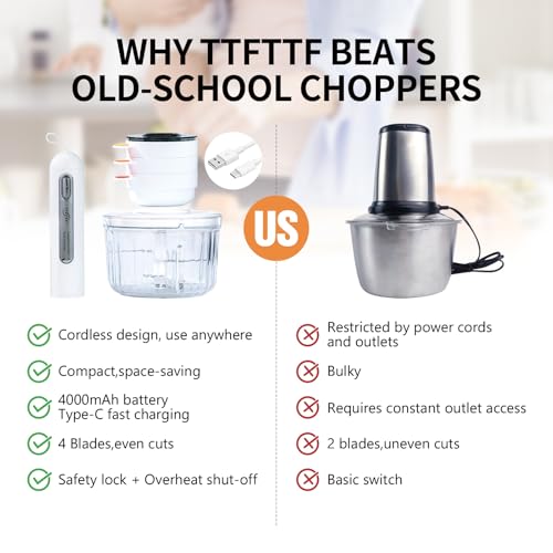 【4000mAh Battery & Type-C Charging】Equipped with a 4000mAh large battery, TTTFFT Food Processor delivers 40+ powerful chopping cycles per charge (500g beef per batch). The Type-C charging port ensures fast and convenient charging, ensuring it remains ready for use at all times (Note: Please do not use it while it is charging)