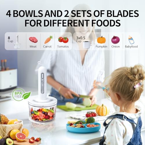 【Powerful Kitchen Helper】TTFTTF Food processor offers professional-grade chopping experience with 6 stainless steel blades. Effortlessly grind meat, chop vegetables, and blend sauces in seconds using the dual blade system (4+2 blades). The 8-cup bowl handles family-sized tasks, while the 3×0.5-cup bowls are perfect for spices, Fruits, and baby food