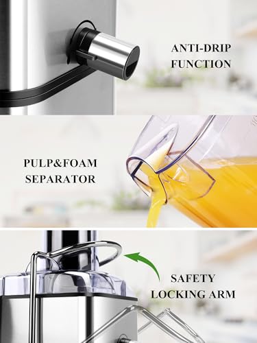 【Powerful Motor for Maximum Juice Yield】With its powerful 1100 watt motor and cold extraction stainless steel filter, this juicer extracts up to 85% of juice from fruits and vegetables, ensuring you get the most out of your produce. Its easy separation of pulp and juice and minimal nutrient loss mean you can enjoy a glass of fresh, healthy juice in seconds.