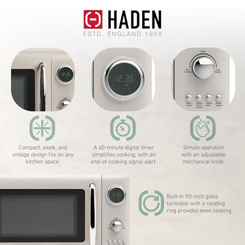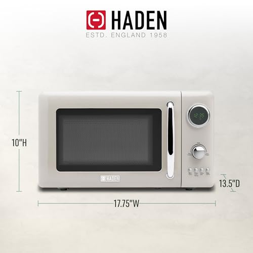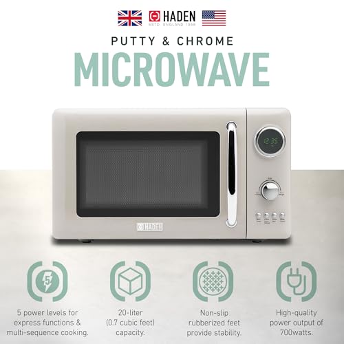 Specification: Haden 700 Watt 0.7 Cubic Foot Microwave Oven with Digital Controls, Defrost, and Instant Start Countertop Small Appliance, Putty/Chrome