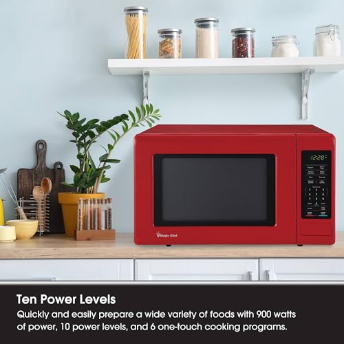 Specification: Magic Chef 0.9 Cubic Feet 900 Watt Small Stainless Countertop Microwave Oven for Compact Spaces w/ 6 Pre Programmed Cooking Modes, Red