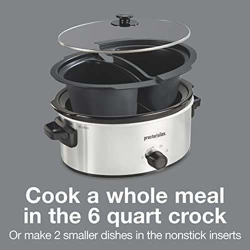 Proctor Silex Double Dish Slow Cooker with 6qt Crock and Dual 2.5qt Nonstick Insert to Cook Two Meals at Once, Dishwasher Safe Pot & Lid, Silver (33563)