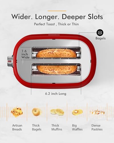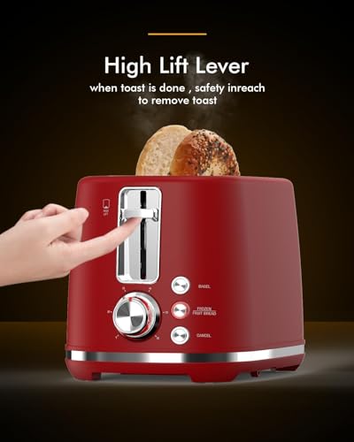 Specification: 2 Slice Toaster with Extra Wide Slots & Removable Crumb Tray, 6 Browning Options, Auto Shut Off & Frozen Function, Toast Fruit Bread, Bagel & Waffle, Red