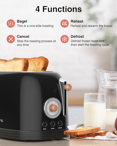 CROWNFUL 2-Slice Toaster, Extra Wide Slots Toaster, Retro Stainless Steel with Bagel, Cancel, Defrost, Reheat Function and 6-Shade Settings, Removal Crumb Tray, Black