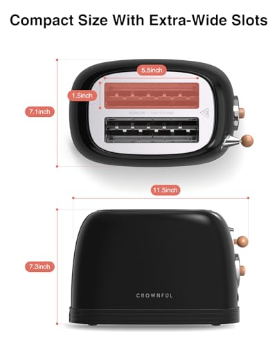 Specification: CROWNFUL 2-Slice Toaster, Extra Wide Slots Toaster, Retro Stainless Steel with Bagel, Cancel, Defrost, Reheat Function and 6-Shade Settings, Removal Crumb Tray, Black
