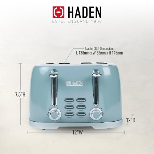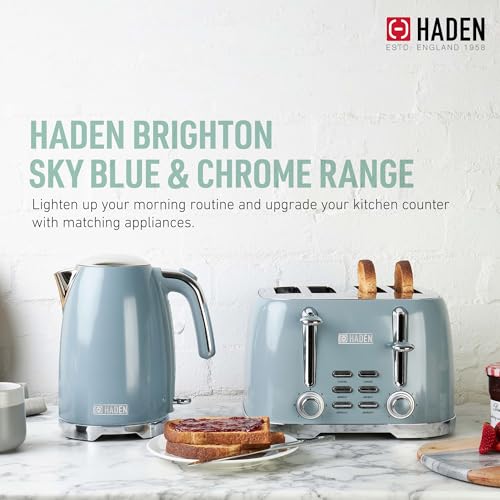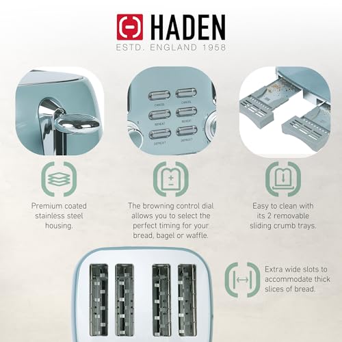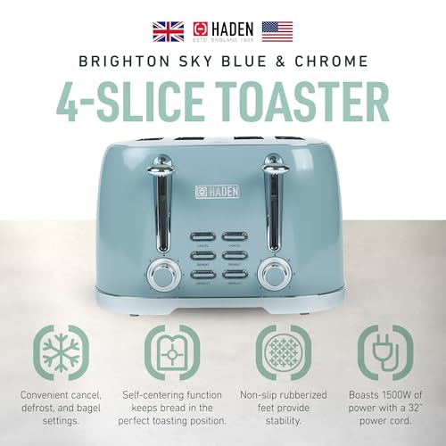 Specification: Haden Brighton 4 Slice Wide Slot Stainless Steel Toaster with Adjustable Browning Control & Non-Slip Feet, Sky Blue & Chrome