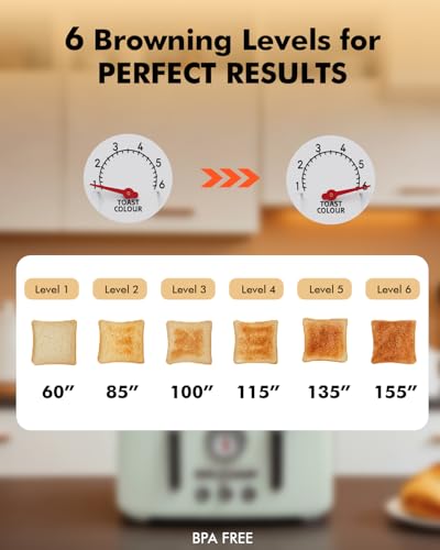 Specification: Retro 4-Slice Toaster 1.6″ Wide Slots – 6 Toast Settings with Bagel Function, Stainless Steel Body, Defrost/Cancel Button & Crumb Tray, Vintage Green