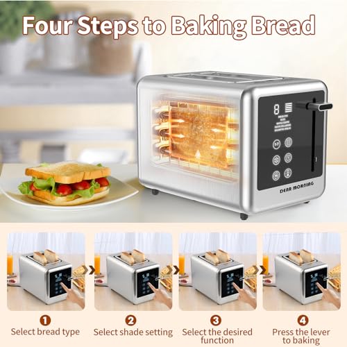Smart Toaster Digital Tuch Screen Toaster with 5 Bread Selection 7 Shade Setting and Bagel/Defrost/Cancel/Reheat Function 1.5” 2 Slice Stainless Steel Toaster with Removable Crumb Tray