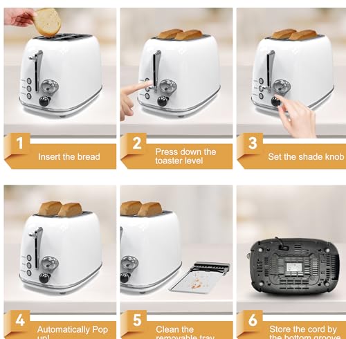 Specification: Toaster 2 slice,Retro Stainless Steel Toaster with 6 Settings, 1.5 In Extra Wide Slots, Bagel/Defrost/Cancel Function, Removable Crumb Tray (White)