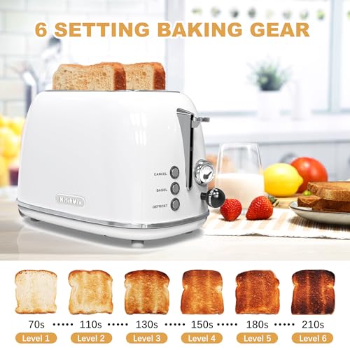 Toaster 2 slice,Retro Stainless Steel Toaster with 6 Settings, 1.5 In Extra Wide Slots, Bagel/Defrost/Cancel Function, Removable Crumb Tray (White)