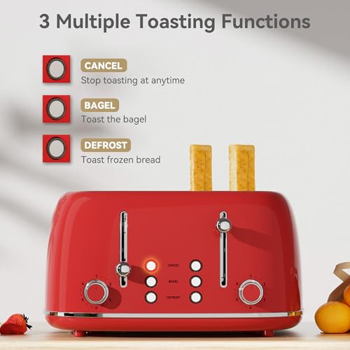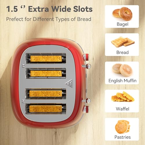 Specification: Toaster 4 Slice, Retro Stainless Toaster with 6 Bread Shade Settings,1.5”Wide Slots Toaster with Cancel/Defrost/Reheat Functions,Dual Independent Control Panel, Removal Crumb Tray (Red)
